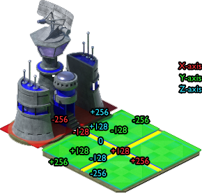 Here we can see the X axis, Y axis, and Z axis offsets in leptons from the center (0) of the building, where the red cells are not docks. As an example, from this image you can see that if you wanted to make Dock #5 where the topmost red cell is located, you would use DockingOffset4=-256,-128,0 where the center of that cell's X coordinate is -256 and center of the cell's Y coordinate is -128.